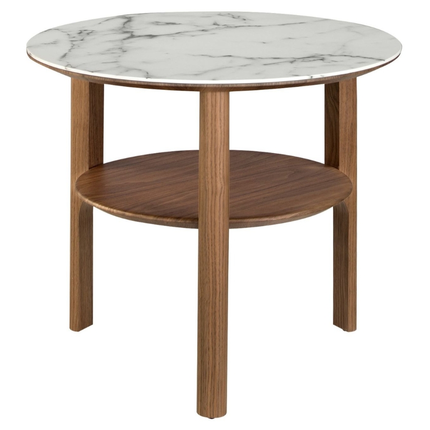 Jemná kombinace bílého porcelánu s mramorovým dekorem a ořechové dýhy dělá z tohoto odkládacího stolku skutečný designový šperk. Kulatá deska s jemnými šedými žilkami dodá vašemu prostoru lehkost a elegantní šmrnc. Spodní policie nabízí praktický úložný prostor pro odložení nejrůznějších nezbytností, které vám tak nebudou překážet na vrchní desce. Díky svému čistému a vzdušnému vzhledu stolek skvěle zapadne do moderních interiérů s prvky přírodních materiálů.